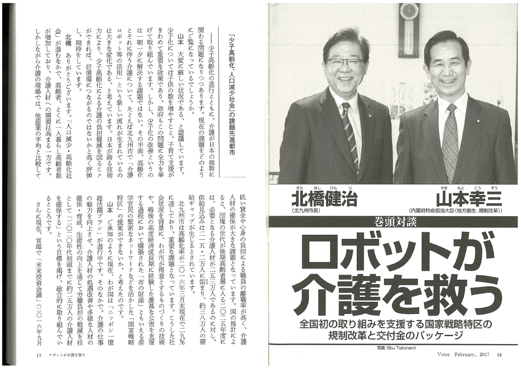 今回は、北九州市の北橋市長とともに、主に介護ロボットなど市の国家戦略特区における取り組みについて対談を行ったものです。